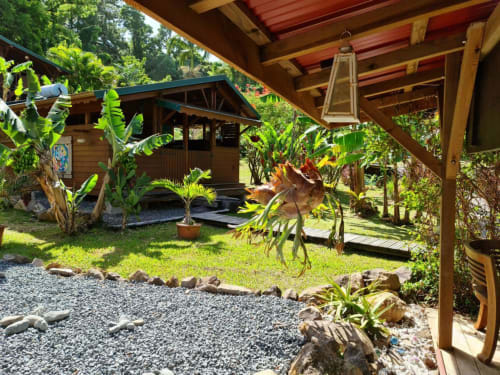 Vos hôtes Laurence et Eric, accompagnateurs en montagne et fondateur de Vert-Intense, parcourent depuis plus de vingt ans les traces du Parc National de la Guadeloupe. Amoureux de la Guadeloupe et des sports de nature, ils se font un plaisir de vous conseiller. Sportif accompli, randonneur tranquille, amoureux de nature sauvage, la Guadeloupe va vous séduire. Le site n est pas encore accessible aux personnes à mobilité réduite. Labélisé Ecolabel européen les Bananes Vertes s'inscrivent dans la recherche d'un tourisme le plus respectueux possible. Les constructions sont en bois, l'eau de pluie est récupérée, les chauffes eaux sont solaires, l'utilisation de l'électricité est réduite au maximum avec l'utilisation de lampes basse consommation et une préférence pour le gaz dès que possible. Depuis Juillet 2021, avec l'aide de la Région Guadeloupe, le site produit grâce à un équipement photovoltaïque plus 80% de sa consommation électrique.